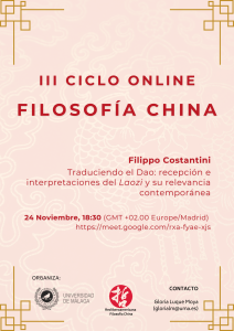 El próximo lunes 24 de noviembre a las 18:30 h. el profesor e investigador Filippo Costantini (Universidad de Cagliari, Italia) ofrecerá la segunda conferencia del III Ciclo de Conferencias Online sobre Filosofía China, titulada «Traduciendo el Dao: recepción e interpretación del Laozi y su relevancia contemporánea». La conferencia tendrá lugar en el Aula 14 de […]
